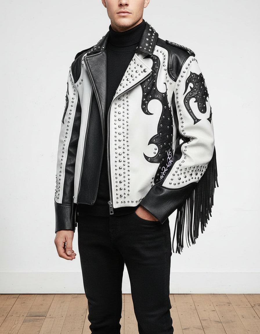 Men's White Two-Tone Studded Leather Biker Jacket